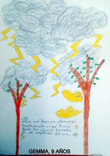 También Naira, 9 años, se inspiró en mi poema y aquí muestro su fantástica interpretación. La verdad es que me hace pensar lo que un rayo puede dejar en su descarga natural y en la mente de Naira. A ella le dedico este poema inspirado en su obra de arte.