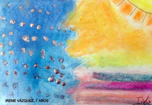Irene Vázquez, 7 años, es otra alumna de Cris que se inspiró en mis versos. Ella interpretó muy bien la lluvia, el sol mirándose en el agua… Los colores hablan por sí solos.