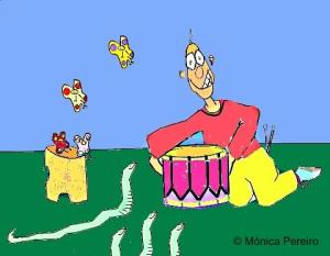 Uno de los niños, que ya se había hecho amigo de Canguro, quiso que Pez y canguro escucharan el sonido de su tambor y, ni corto ni perezoso, se acercó a la Laguna y en la misma orilla tocó su tambor para que Canguro saltara y Pez bailara al son.
