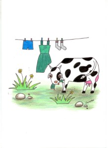 Vaca Paca se despertó al amanecer, la borrachera de Picaflor, despertó a todo el pueblo y la mamá de Tararí Tararí, había tendido al sol uno de los vestidos verdes que la modista del pueblo había diseñado para la más joven de las manzanas, una adolescente a la que ya le asomaban los colores y se ruborizaba con frecuencia… en primavera. El vestido verde era precioso, las demás manzanas bordaron una flor en su pechera y era de tirantes veraniegos… Vaca Paca estaba feliz y prefirió dar un bocado a vestido verde, quería saber si sabía a flor, así bocado a bocado se lo zampó.