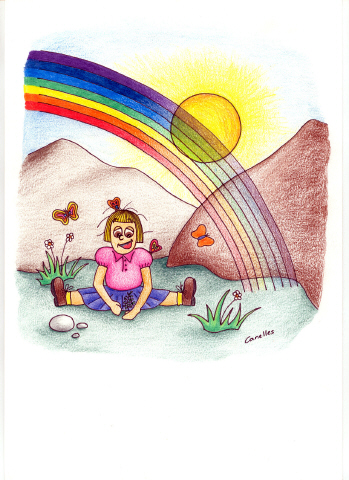 Las mariposas avisaron a Tararí Tararí, la canción más feliz que cantaban los niños y les hacía sonreír. Las nubes que anoche cubrían a lunita triste, dejaron su lluvia en manzano y como ya había salido el sol, nació un caro-iris precioso y, dicen las malas lenguas, que desde esa noche lunita triste nunca más lloró de tristeza y mientras sus amigos dormían ella aprendió a sonreír y se oía una canción en las altas horas de la noche que decía…
