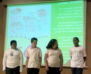 Hola amigos/as, el pasado día 26 de Mayo de 2010, a las 17 horas, como ya es costumbre, en el Auditorio del Centro Cultural Fray Luis de León, en Guadarrama, Madrid, cada uno de los que allí estábamos, pudimos disfrutar de un recital de poesía con niños y PARA TODOS. Fue un programa delicioso, once poemas interpretados por los niños del Colegio Sierra de Guadarrama, niños que ilustraron los poemas que allí se recitaron y que todos pudimos ver con detalle en pantalla grande. Pero además, sentimos y apreciamos la voz en vivo de MÓNICA PÉREZ ROMERO, que fue la autora de la música del recital y ella misma interpretó, con los niños, algunos poemas. Mónica es la Profesora de Música del Colegio Sierra de Guadarrama. Su voz mostró la sensibilidad y el buen hacer de sus composiciones, así como la imaginación y el buen gusto en armonía con los temas tratados. Yo escribí los poemas y, me sentí muy halagada por el buen trato que se le dio al verso, tanto por parte de los profesores como de los niños, siempre al unísono con la música y con el dibujo. Fue así como todos formamos parte de una tarde preciosa e inolvidable. Pero nada hubiera sido posible, sin la acogida incondicional del Centro Fray Luis de León, su Director, José Luis Cancelo, con su acostumbrada cordialidad, nos hizo sentir en nuestra propia casa por segunda vez, él y toda la Comunidad Agustiniana. Se nos abrió de par en par el Auditorio, el Centro, y todos, niños, profesores, padres, visitantes y artistas nos sentimos muy a gusto y encantados con la música, la poesía y la creatividad allí expuesta. He de destacar encarecidamente el trabajo y la entrega de los profesores del Colegio Sierra de Guadarrama. Su labor magistral se vio reflejada en este acto. Elisa y Mónica se dejaron la piel en la enseñanza de la Poesía y de la Música y esto, creo yo, es un ejemplo de lo mucho por hacer en la Enseñanza de nuestros días. Un ejemplo en vivo, ya que vimos cómo los niños son receptivos al Arte y sólo necesitan eso, voces acordes que los dirijan y los lleven a este mundo de la creatividad tan amplio y necesario para sus propias vidas, ya que a través del Arte, ellos luego, serán artistas. POESÍA EN VIVO, por segunda vez, nos entusiasma a todos, para seguir escribiendo versos, música, voces que son ya memoria en la dimensión del tiempo, y lo son porque hemos sido capaces de hacer algo bueno por nosotros y por los demás.